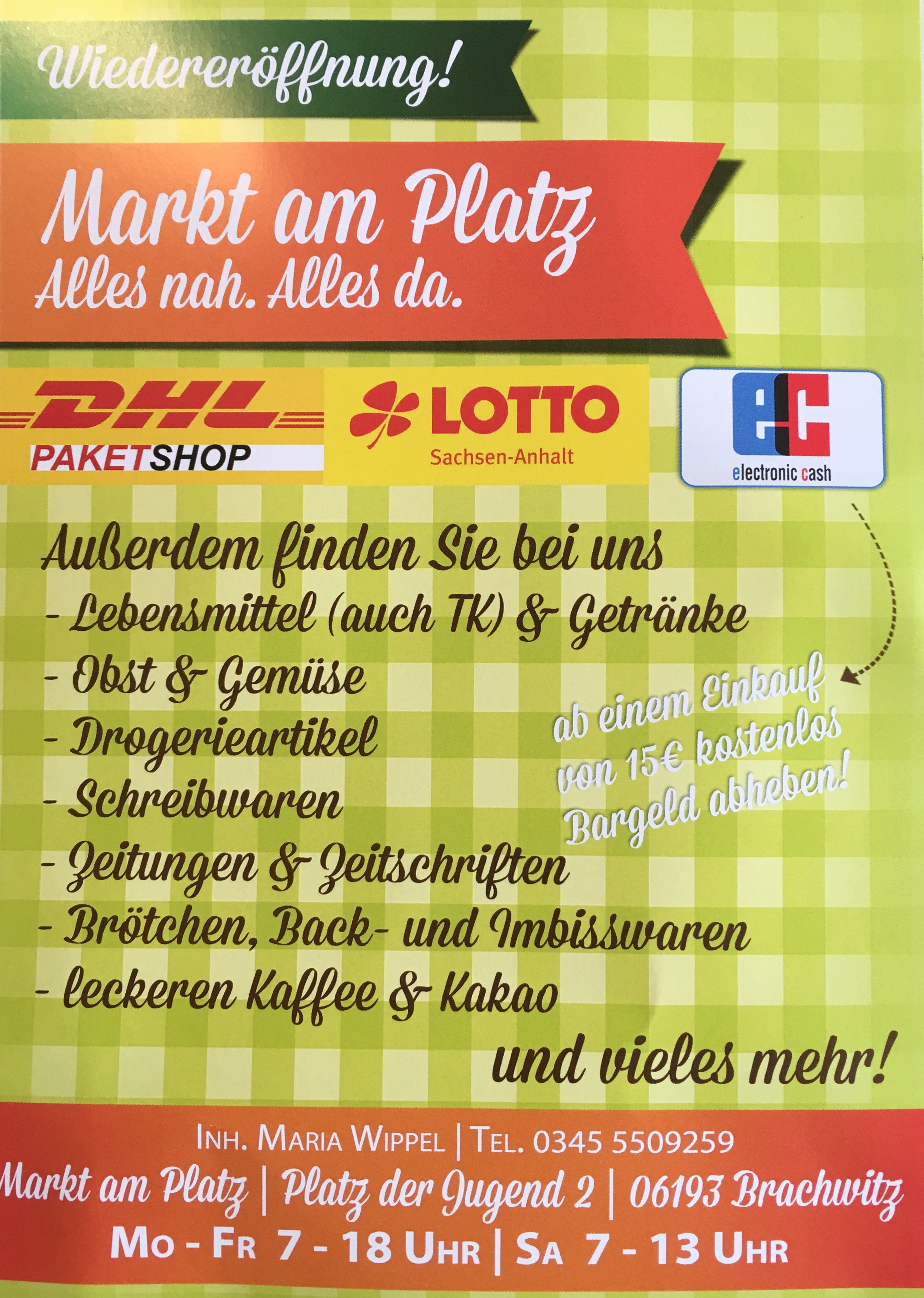 Brachwitz-Dorfladen Wetterstation Brachwitz Veröffentlicht am September 22, 2016 von adminSeptember 22, 2016 Brachwitz-Dorfladen Markt am Platz, so heißt der neue Laden für alle Dinge des Alltags im schönen Brachwitz. Das erhöht die Lebensqualität in unserem Dorf sehr. Teilen mit: Klicken zum Ausdrucken (Wird in neuem Fenster geöffnet) Drucken Klicken, um einem Freund einen Link per E-Mail zu senden (Wird in neuem Fenster geöffnet) E-Mail Klicke, um auf X zu teilen (Wird in neuem Fenster geöffnet) X Klick, um auf Facebook zu teilen (Wird in neuem Fenster geöffnet) Facebook Klicken, um auf WhatsApp zu teilen (Wird in neuem Fenster geöffnet) WhatsApp Gefällt mir:Gefällt mir Wird geladen … Ähnliche Beiträge