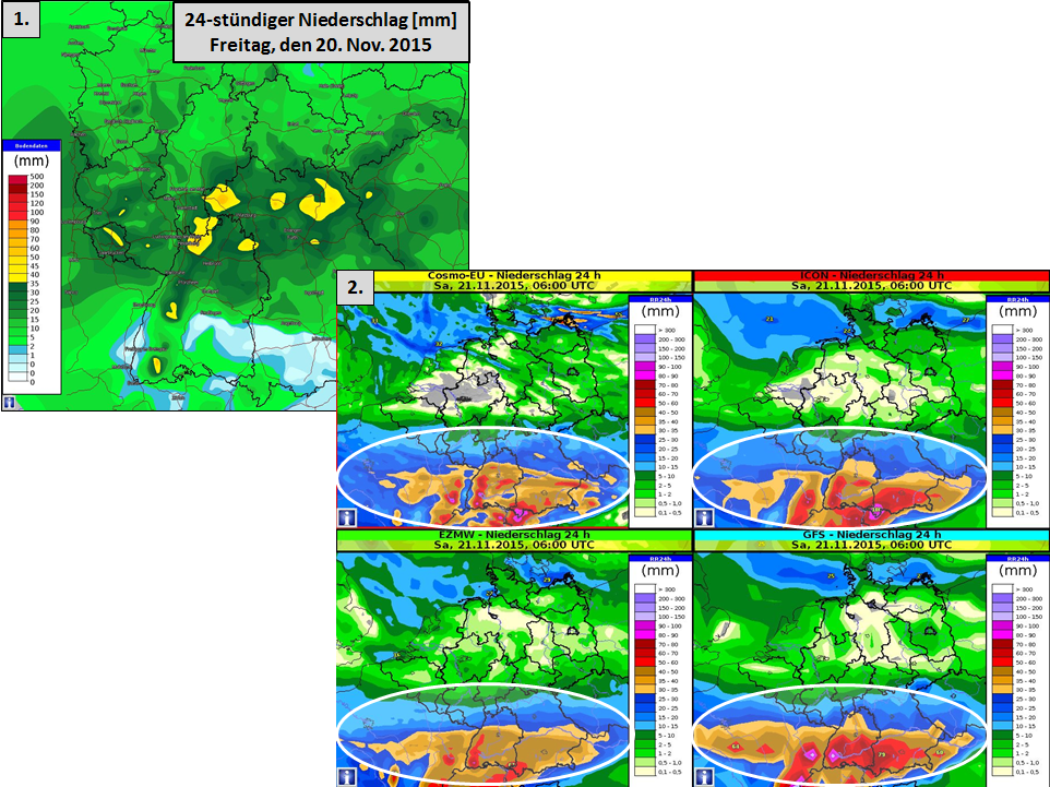 Mit den länger andauernden Niederschlägen von Randtief „Kunibert“ sind vorwiegend die Regionen zwischen Oberrhein und Bayerischem Wald bzw. Passauer Land betroffen. Bis Samstagmorgen sollen in dem genannten Streifen verbreitet zwischen 25 und 60 Liter pro Quadratmeter fallen. In Staulagen sind sogar 24-stündige Mengen bis 90 Liter möglich (vgl. Abbildung 2). Insgesamt sind in der Südhälfte Deutschlands über einen 48-stündigen Zeitraum hinweg Niederschlagsmengen zwischen 30 und 100 Liter, exponiert auch bis 120 Liter pro Quadratmeter zu erwarten.