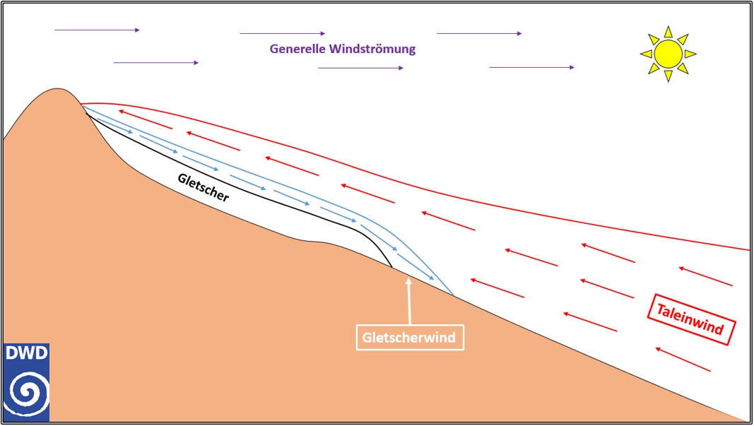 Gletscherwinde stellen eine Umkehrung der sonst tagsüber in Bergtälern zu erwartenden Taleinwinde dar. In den Sommermonaten bläst der Gletscherwind nahezu kontinuierlich sowohl am Tag als auch in der Nacht. Am Tag gleitet der wärmere, entgegengesetzte Taleinwind dann über den Gletscherwind auf und legt noch eine gewisse Strecke bis zu den Gipfellagen zurück. Oberhalb des Kammniveaus weht ein von der Topographie unbeeinflusster Wind.
