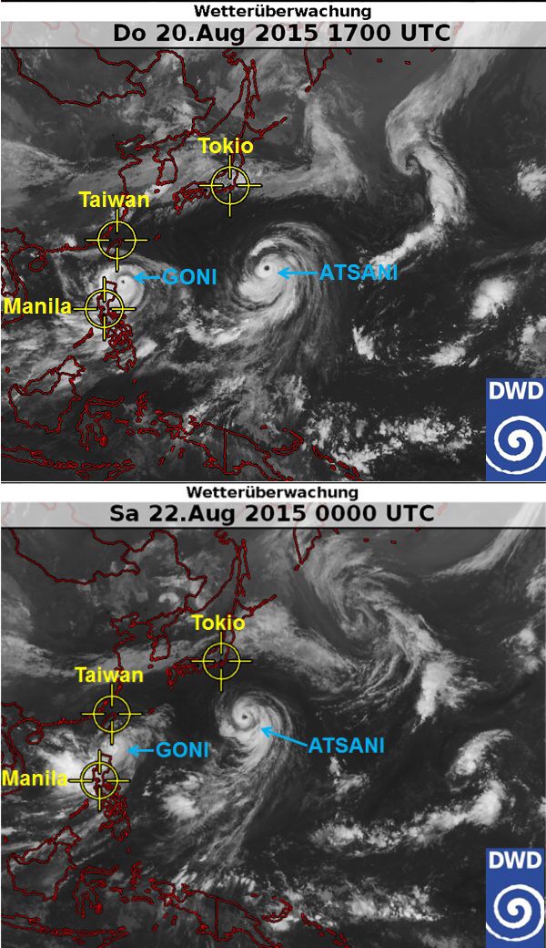 Während die Hurrikansaison im Atlantik sehr schwach ausgeprägt ist, entstehen im Nordwestpazifik fast jede Woche neue Taifune (so werden tropische Wirbelstürme im Pazifik genannt). So sind auch in dieser Woche zwei Taifune, namens GONI und ATSANI (Nr. 16 und 17 in dieser Saison), auf dem Nordwestpazifik vom Satelliten aus zu erkennen. Auf der Seite www.dwd.de/tagesthema können Sie die „Augen“ im Satellitenbild (20.08.2015, 17 UTC und 22.08.2015, 00 UTC) sehen.
