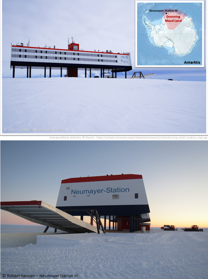 Doch nun zurück zur Neumayer-Station. Diese liegt am nordöstlichen Rand der Weddell See auf 70°40’S und 8°16’W auf dem Ekström- Schelfeis, was einer ständigen – wenn auch kaum wahrnehmbaren – Drift unterliegt. So legt die Station jährlich rund 150 Meter Richtung Schelfeiskante zurück, in 25 Jahren entspricht der einer ungefähren Strecke von vier Kilometern. Bis zum offenen Wasser ist es aber noch ein Weilchen hin, ihr vorgelagert ist erst in rund 30 km Entfernung die Atka Bucht. Deren Meereis wird gegen Ende des Südsommers zunehmend brüchig, was die Versorgung durch das deutsche Forschungsschiff „Polarstern“ erleichtert.