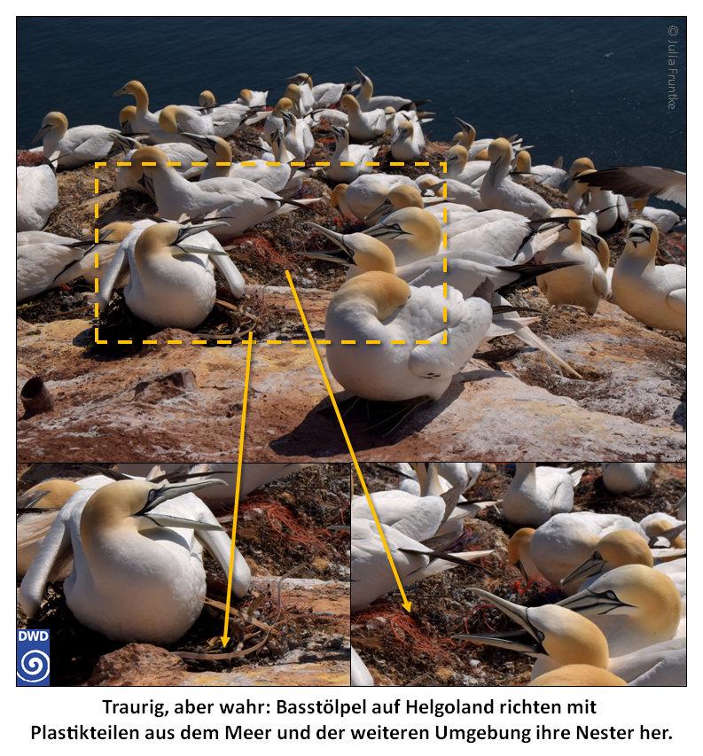 Wenn aber der Kunststoff teilweise so klein ist, dass er kaum sichtbar ist, warum ist er dann in den Ozeanen und für die Umwelt so gefährlich? Durch die Wechselwirkung von Salzwasser und UV-Strahlung sowie durch Reibung zerfällt das Plastik sehr langsam in kleine Bruchstücke und gibt dabei Giftstoffe an die Umgebung ab. Bis zur völligen Zersetzung von Plastik vergehen 350 bis 400 Jahre. Viele Tiere sterben durch verlorengegangene Fischereiausrüstung, in der sie sich verfangen, oder verschluckten Müll, den sie nicht verdauen können. Darüber hinaus können Mikropartikel und die freigewordenen Giftstoffe über die Meeresbewohner auch in unsere Nahrungskette und in den menschlichen Organismus gelangen. Zudem ist nicht ausgeschlossen, dass solche Gifte in den atmosphärischen Wasserkreislauf geraten und sich mit dem ausfallenden Niederschlag weiter in der Umwelt verbreiten.