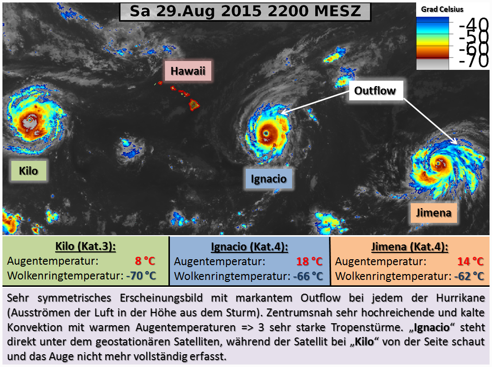Dann gibt es aber noch eine thermodynamische Herangehensweise, wo entsprechend die Ausprägung der Konvektion direkt ums Zentrum betrachtet wird. Mal besteht diese nur aus kurzlebigen Ausbrüchen von hochreichender Konvektion (dies wird als „pulsierende“ Konvektion bezeichnet), mal verschwindet das Zentrum unter einem massiven Konvektionsschirm, wobei Letzteres auf stetige Verstärkung hindeutet. Sollte sich ein Auge ausgebildet haben, dann kann auch die Temperaturdifferenz zwischen dem warmen Auge, in dem die Luft absinkt und sich erwärmt, und der niedrigen Temperatur der das Auge umgebenden Konvektion auf die Intensität hindeuten. Je stärker diese Temperaturgegensätze ausfallen, desto intensiver ist der Sturm. Ein Beispiel vom 29. August 2015 finden Sie unter www.dwd.de/tagesthema.