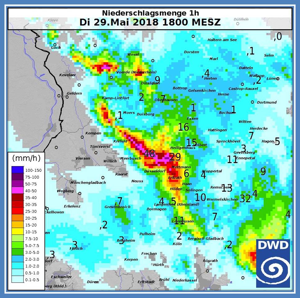 Vonseiten des Deutschen Wetterdienstes münden solche Wetterlagen häufig in einer sogenannten Vorabinformation vor zu erwartenden schweren Gewittern für einige Teile Deutschlands. Dabei ist eine potenziell sehr gefährliche oder sogar extrem gefährliche Wetterentwicklung erkennbar. Gebiet, Zeit und Intensität sind aber noch nicht hinreichend gesichert. Nicht selten endet die ausgegebene Vorabinformation, die wohlgemerkt noch keiner Akutwarnung entspricht (!), hinterher beim Kunden jedoch mit einer Enttäuschung über ausbleibende Gewitter. Die Schwierigkeit dabei ist, dass Gewitter an einer Stelle oft sehr starke Begleiterscheinungen aufweisen, einige Kilometer entfernt davon aber überhaupt nichts passiert oder vielleicht nur fünf Tropfen vom Himmel fallen. So gab es z.B. gestern in Düsseldorf die oben bereits erwähnten 48 l/qm in einer Stunde, knapp 5 Kilometer davon entfernt in Meerbusch fiel jedoch fast gar nichts an Regen und im jeweils etwa 10 Kilometer entfernten Willich und Kaarst blieb es sogar trocken (siehe dazu auch die Grafik zu den einstündigen Niederschlägen am 29.05.2018 um 18 Uhr MESZ in NRW unter https://www.dwd.de/DE/wetter/thema_des_tages/2018/5/30.html).