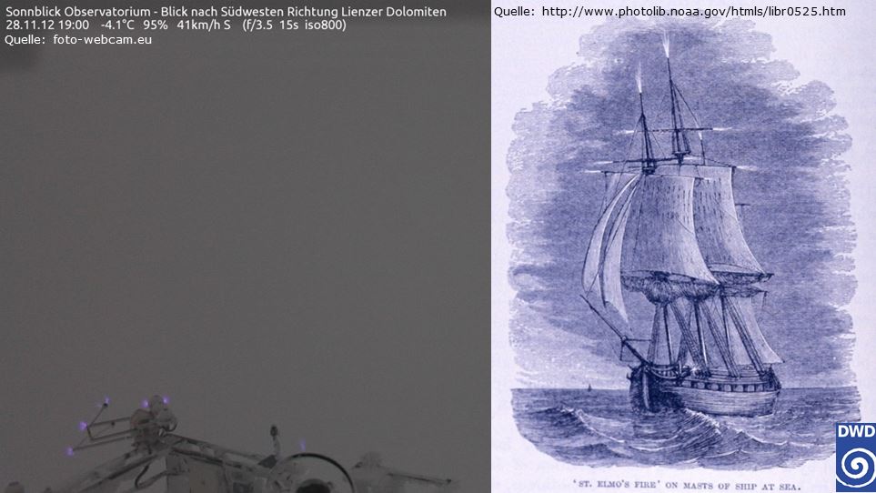 Somit begünstigen Objekte oder Gegenstände wie Gipfelkreuze, Kirchtürme oder Schiffsmasten das Elmsfeuer bei aufziehenden Gewittern. Aber auch die Messinstrumente des Sonnblick Observatoriums am Gipfel des Hohen Sonnblicks auf 3106 Metern in den österreichischen Alpen blieben nicht vom Elmsfeuer verschont. Dort wurde das Phänomen am 28. November 2012 um 19 Uhr von einer Webcam aufgezeichnet, deren Aufnahmen uns freundlicherweise von der Seite www.foto-webcam.eu zur Verfügung gestellt wurden (siehe linke Abbildung unter www.dwd.de/DE/wetter/thema_des_tages/2018/6/26.html).