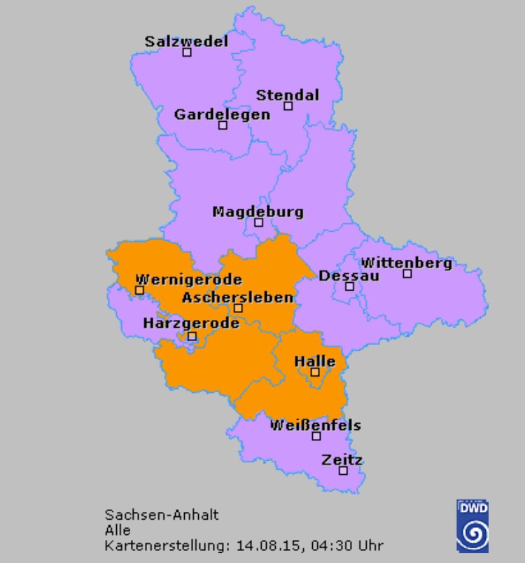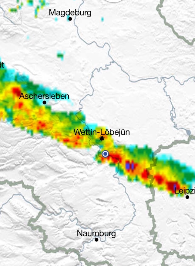 Verlängerung der Warnung: Es treten weiterhin einzelne Gewitter aus Südost auf, dabei Starkregen um 20 l/qm in kurzer Zeit, stürmische Böen zwischen 65 und 75 km/h (Bft 8) und kleinkörniger Hagel. ACHTUNG! Hinweis auf mögliche Gefahren: Örtlich kann es Blitzschlag geben. Bei Blitzschlag besteht Lebensgefahr! Vereinzelt können beispielsweise Bäume entwurzelt und Dächer beschädigt werden. Achten Sie besonders auf herabstürzende Äste, Dachziegel oder Gegenstände. Während des Platzregens sind kurzzeitig Verkehrsbehinderungen möglich.