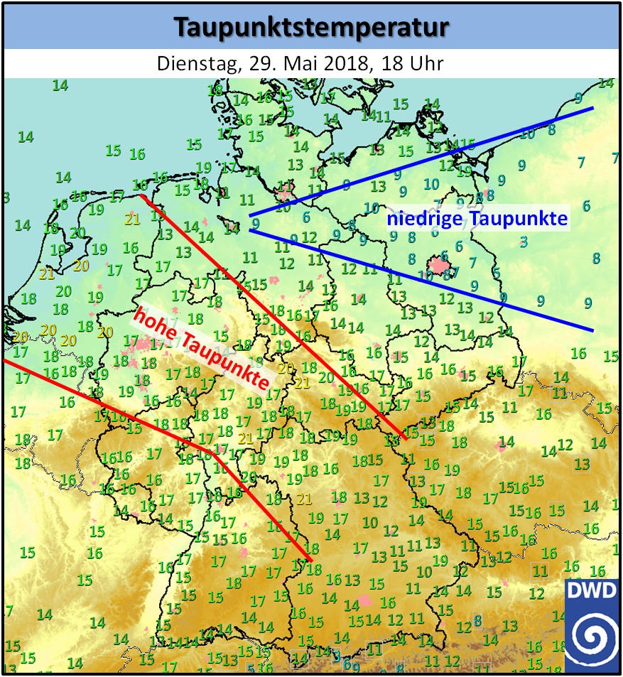 In der unten angefügten Abbildung erkennt man in einem Streifen von Nordrhein-Westfalen über Hessen bis nach Franken hohe Taupunkte zwischen 17 und 21°C. Das empfindet der Mensch als schwül. Ein Kubikmeter Luft enthält dann etwa 15 bis 20 Gramm Wasserdampf. In diesem Korridor entwickelten sich am vergangenen Dienstag erwartungsgemäß heftige Gewitter, die zum Beispiel Teile Wuppertals unter Wasser setzten. Anders sieht es im Nordosten Deutschlands aus. Dort lagen die Taupunkte nur bei 3 bis 9°C, was etwa 6 bis 9 Gramm Wasserdampf pro Kubikmeter entspricht. Obwohl dort die Temperatur auf heiße 30 bis 33 Grad anstieg, fühlte sie sich weniger schwül als in den übrigen Gebieten an. Deshalb war es auch nicht überraschend, dass es dort trocken blieb.