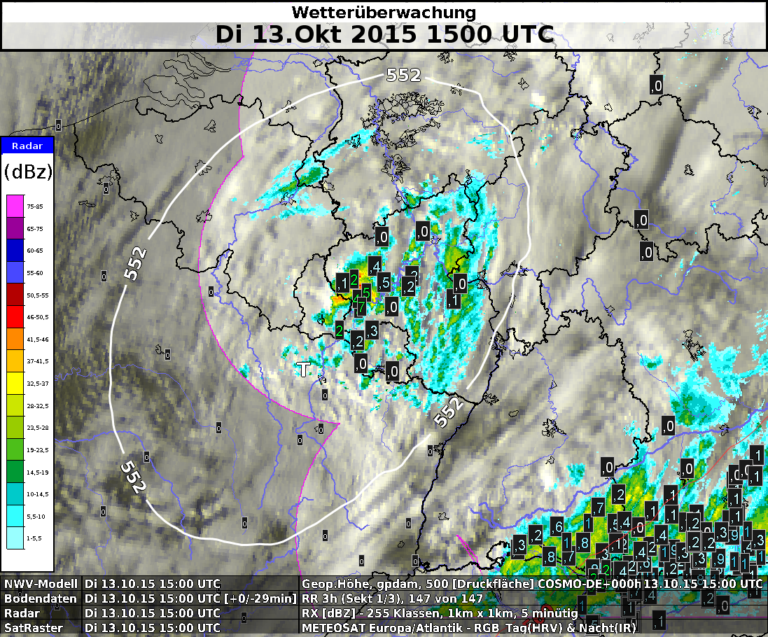 Zur Illustration finden Sie unten eine Karte der dreistündigen Niederschlagsmengen [l/m² = mm] von gestern Nachmittag, 13.10.2015, 15:00 UTC, unterlegt mit einem Satellitenbild und ergänzt durch Radarinformationen. Die geschlossene weiße Kurve charakterisiert das Zentrum des Höhentiefs innerhalb der 500-hPa-Hauptdruckfläche mit einer geopotentiellen Höhe von 552 gpdam.