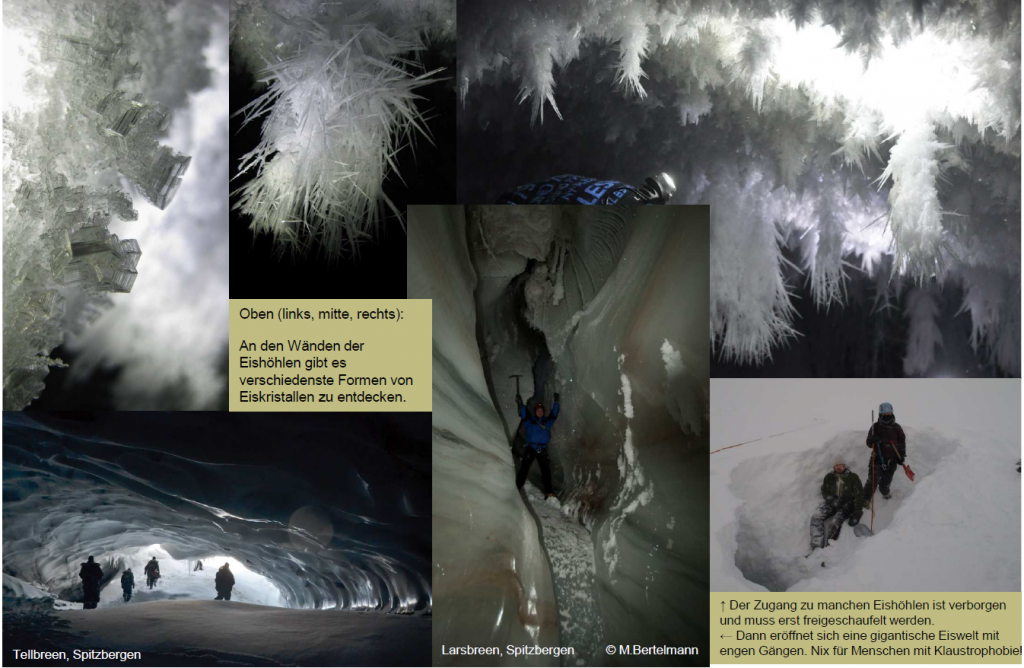 Polare Gletscher finden sich z.B. auf Spitzbergen. Mehr als die Hälfte der Fläche der Inselgruppe ist von Gletschereis bedeckt, wobei es sich meist um kaltbasale Gletscher handelt. Das Gletschereis dort ist so kalt, dass das Schmelzwasser nicht direkt nach unten ablaufen kann, sondern zunächst entlang der Oberfläche fließen muss und nur langsam Kanäle in das Eis „schnitzt“, das unmittelbar an die Oberfläche angrenzt. Manche Kanäle schaffen sich dann einen Weg zum Boden des Gletschers und formen so Eishöhlen, die in ihrer Art sehr besonders sind. Im Winter fallen diese Schmelzwasserhöhlen trocken. Dann können sie begangen werden, bzw. wegen so manch nur kaninchenlochgroßen Durchgängen auch nur „bekrochen“ – und bieten faszinierende Einblicke in das Innere eines Gletschers (siehe Fotos).