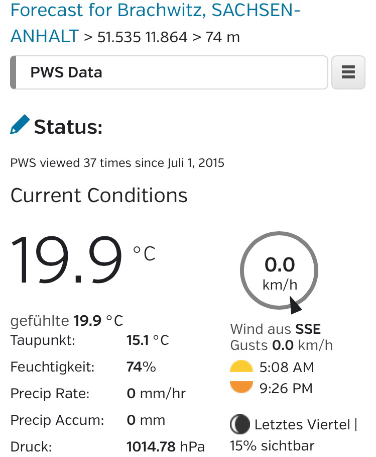 Jetzt auch bei Weather Underground Wetterstation Brachwitz Veröffentlicht am Juli 12, 2015 von adminJuli 12, 2015 http://www.wunderground.com/personal-weather-station/dashboard?ID=ISACHSEN329 Teilen mit: Klicken zum Ausdrucken (Wird in neuem Fenster geöffnet) Drucken Klicken, um einem Freund einen Link per E-Mail zu senden (Wird in neuem Fenster geöffnet) E-Mail Klicke, um auf X zu teilen (Wird in neuem Fenster geöffnet) X Klick, um auf Facebook zu teilen (Wird in neuem Fenster geöffnet) Facebook Klicken, um auf WhatsApp zu teilen (Wird in neuem Fenster geöffnet) WhatsApp Gefällt mir:Gefällt mir Wird geladen … Ähnliche Beiträge