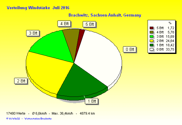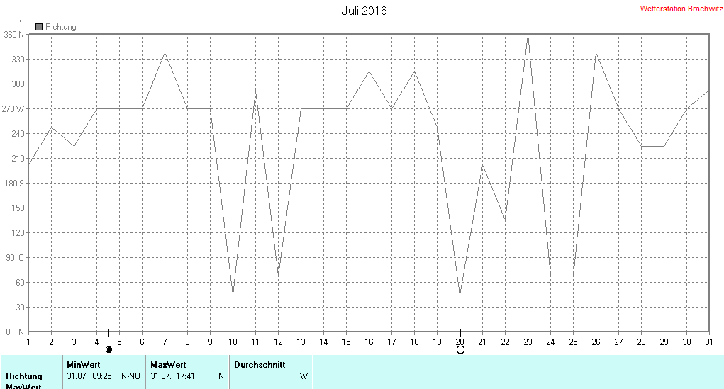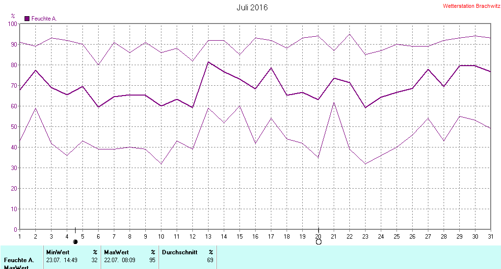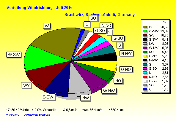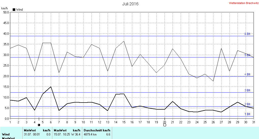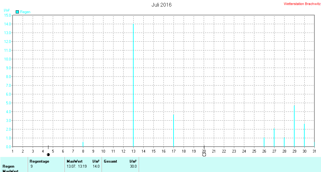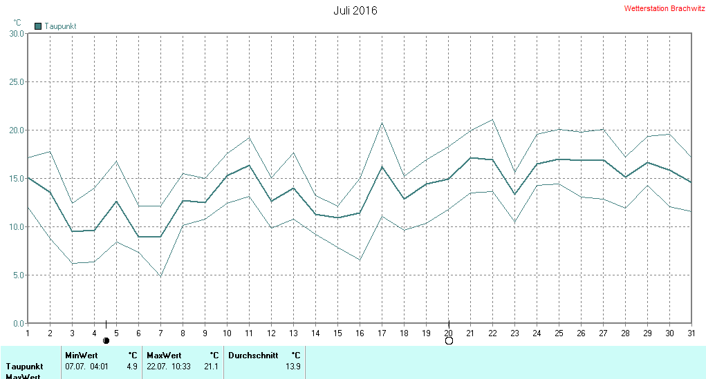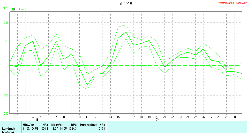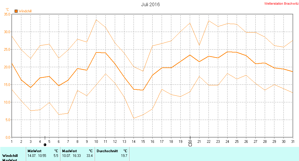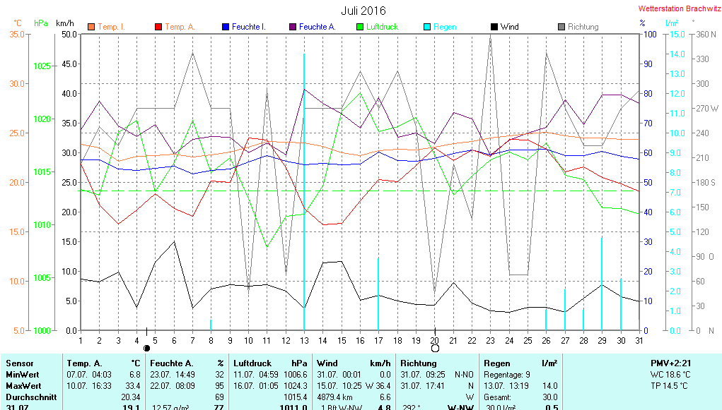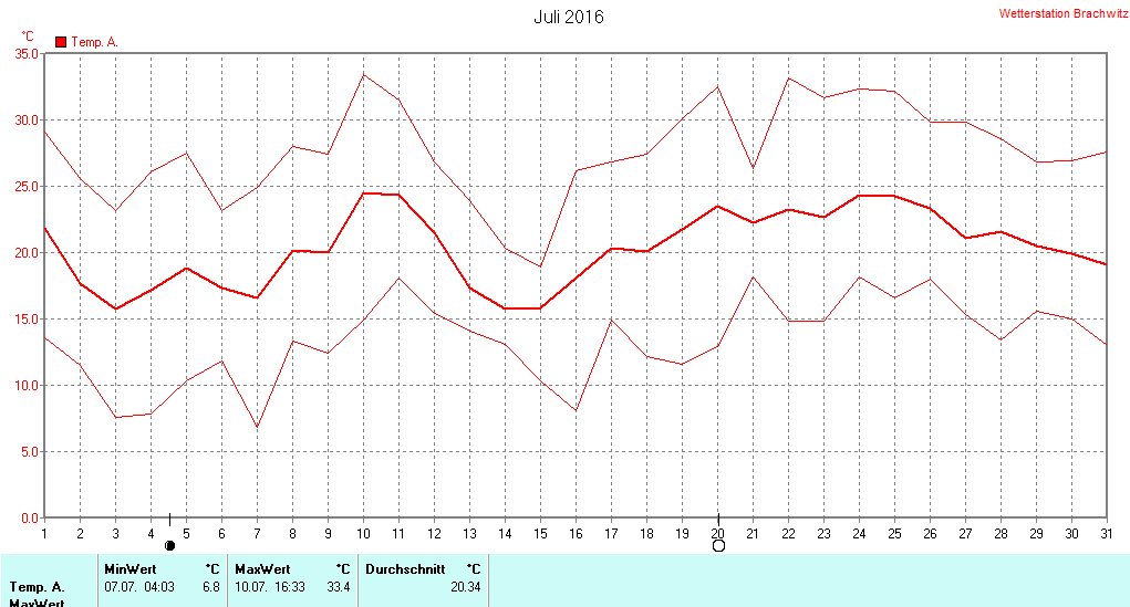 Der Juli 2016 war relativ normal für einen Sommermonat. Es gab zum Glück keine Unwetter wie im Juli 2015. Der Monat war mit 20,34°C etwas über dem langjährigen Mittelwert von 18 °C. Vor allem die Nächte waren sehr war. Seit langem erreichte die Wetterstation Brachwitz wieder eine Tropische Nacht (25./26.07.2016), d.h. die Temperatur ist in der Nacht nicht unter 20°C gefallen. Der Monat war ziemlich trocken. Nur 30 Liter statt 48 Liter pro Quadratmeter fielen in den 31 Tagen.