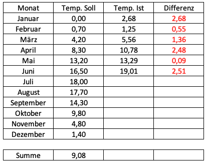 Der Juni war schon ein richtiger Sommermonat. Es gab 28 warme Tage(Tmax>20°C) und 16 davon waren Sommertage(Tmax>25°C). Natürlich bringt ein warmer und sonniger Monat auch negative Dinge. Er war im Durchschnitt zu warm (+2,51 Grad) und zu trocken (-30,4L/qm)