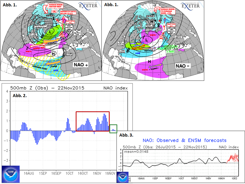 Der aktuelle Wintereinbruch in Nord-, Nordwest- und Mitteleuropa und somit auch in Deutschland lässt sich ebenso sehr gut anhand der NAO veranschaulichen, wie auch die vorangegangene sehr milde Witterungsperiode. Von Mitte Oktober bis Mitte November herrschten mit einer lediglich kurzfristigen Unterbrechung deutlich positive NAO-Indexwerte vor. In der Spitze wurden um den 10. November Indexwerte von etwa 1,8 verzeichnet (vgl. Abb. 2). In einem gesamten Indexbereich von -4 bis +4, traten in den letzten 65 Jahren nur zweimal Werte um +3 auf. Ansonsten liegen die höheren Abweichungen bei etwa +2. Der signifikant positive NAO-Wert von 1,8 der letzten Wochen korrelierte entsprechend mit einer kräftigen Westwinddrift über West- und Mitteleuropa. Zeitweise konnte sich eine ausgeprägte Tiefdruckzone von Neufundland bis nach Russland ausbilden. Die steuernden Tiefzentren befanden sich dabei meist im Umfeld von Island. In die westliche Strömung eingelagert, entwickelten sich schließlich zahlreiche Randtiefs zu Sturmtiefs. Gleichzeitig überdeckte das Azorenhoch einen Bereich vom Meeresgebiet westlich der Azoren bis ins östliche Mittelmeer. Entsprechend stark waren die Luftdruckgegensätze zwischen den NAO-Index-Referenzstationen auf Island und den Azoren ausgeprägt. Auch die typischen Witterungserscheinungen einer positiven NAO-Phase ließen sich über Europa gut beobachten. Während im Mittelmeerraum ruhiges und trockenes Wetter dominierte, sorgten die zahlreichen Sturmtiefs in West-, Nord- und Teilen Mitteleuropas für einen sehr milden, regenreichen und stürmischen Wettercharakter.