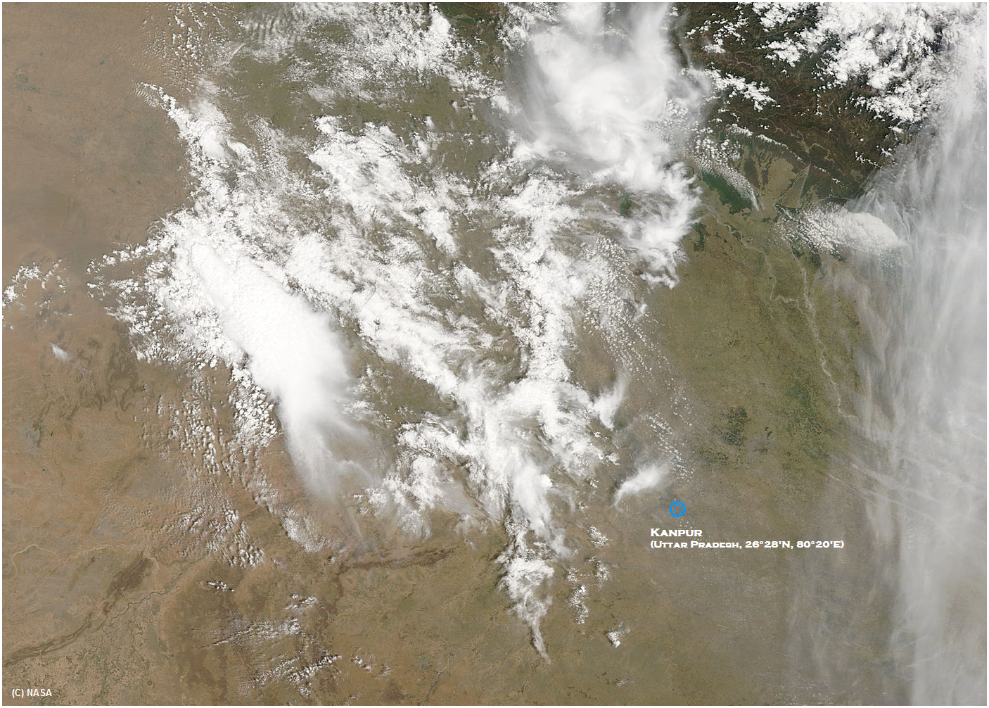 Ein hoch aufgelöstes Satellitenbild, aufgenommen mit dem abbildenden Spektroradiometer MODIS (Moderate Resolution Imaging Spectroradiometer) auf dem polarumlaufenden, sonnensynchronen Erdbeobachtungssatelliten „Terra“, vom 03.05.2018, finden Sie unten. Rechts oben im Bild sieht man einen Ausschnitt des z.T. verschneiten Himalayas und südlich davon als scheinbar schmale Rinnsale die Nebenflüsse des Ganges. Zur Orientierung ist die Station Kanpur (26°28’N, 80°20’E) eingetragen worden. In der linken Bildhälfte beeindrucken die Cumulonimbus-Wolken eines mächtigen Gewitterkomplexes über dem Schwemmland des Yamuna, deren obere Teile als Eisschirm mit der Höhenströmung südostwärts driften.
