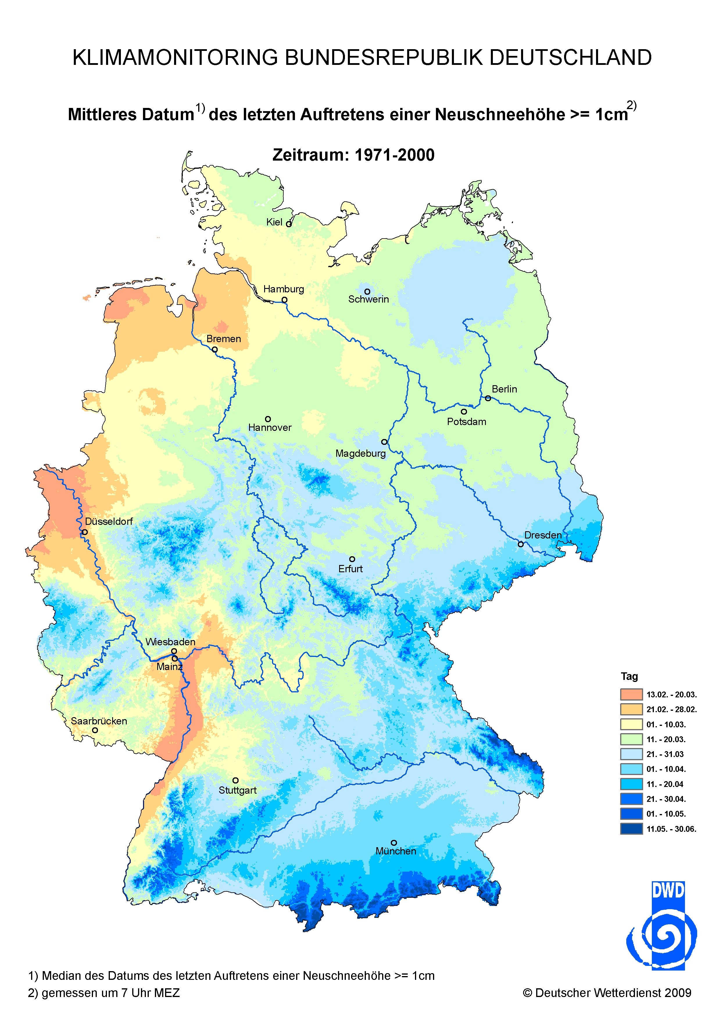 Und wie sah es nun in der Vergangenheit mit den Schneehöhen Ende April aus? Was haben wir überhaupt im langjährigen Mittel zu erwarten? Im Anhang finden Sie eine Karte, bei dem das mittlere Datum des letztens Auftretens einer Schneedecke deutschlandweit zu sehen ist. Betrachtet wird dabei der Zeitraum zwischen den Jahren 1971 bis 2000. Die rötliche Färbung steht dabei für ein frühes Ende des Winters. So treten im Mittel entlang des Rheins sowie in Ostfriesland bereits im Zeitraum von Mitte Februar bis Mitte März die letzten Schneedecken auf. In den blauen Bereichen müssen Sie zum Teil bis in den Juni hinein mit Schnee rechnen. Es verwundert nicht, dass dies vorrangig die höchsten Bergregionen betrifft.