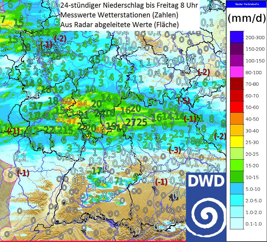 Entlang beziehungsweise knapp südlich einer Luftmassengrenze über der Mitte Deutschlands bildeten sich gestern Nachmittag einige Gewitter, die teils kräftig ausfielen. Insbesondere die Gebiete von Taunus und Rheinhessen ostwärts bis nach Unterfranken wurden wiederholt von Gewittern getroffen, sodass sich dort die größten Niederschlagssummen ergaben. Die Spitzenreiter bezüglich des Niederschlags bis heute Vormittag 8 Uhr heißen Nassau (RP) und Michelstadt (HE) mit jeweils 40 Litern pro Quadratmeter (l/qm) und damit knapp zwei Drittel der üblichen Regenmenge eines Julimonats. Auf den weiteren Plätzen folgen Sprendlingen (RP) und Waldems-Reinborn (HE) mit 37, respektive 34 l/qm. Ein Großteil des Niederschlags fiel dabei, wie bei Gewittern üblich, in kurzer Zeit. Sprendlingen beispielsweise verzeichnete 28 l/qm in nur einer Stunde. Vollgelaufene Keller waren teilweise die Folge.