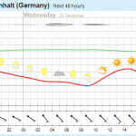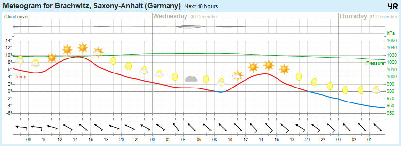 Am Donnerstag scheint bei wenigen Wolken verbreitet die Sonne. Im Nachmittagsverlauf verdichtet sich von Westen her die Bewölkung und gegen Abend setzt im Westen Regen ein. Der schwache Südostwind weht zunehmend kältere Luftmassen heran, so dass die Tageshöchsttemperaturen nur noch zwischen 2 und 5 Grad liegen. Am Nordrand des Harzes werden nochmals 7 Grad erreicht. Auf dem Brocken treten zunehmend schwere Sturmböen bis 100 km/h (Bft 10) auf. In der Nacht zum Freitag ist es bedeckt und verbreitet fällt Schnee, der in den westlichen Landesteilen unterhalb 600 m in Regen übergeht. Bei weiterhin schwachem Südostwind gehen die Temperaturen auf -1 bis -3, östlich der Elbe bis -5 Grad zurück.