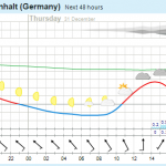 Am Donnerstag verdichtet sich von Westen her die Bewölkung und ab den Mittagsstunden setzt im Westen Regen ein, der bis zum Abend auch den Raum Wittenberg erreicht. Der schwache bis mäßige Wind weht zunächst aus Südost und dreht im Verlauf des Nachmittags auf Südwest. Die Höchsttemperaturen liegen zwischen 3 und 6 Grad. Am Nordrand des Harzes werden nochmals 8 Grad erreicht. Auf dem Brocken treten schwere Sturmböen bis 100 km/h (Bft 10) auf. Im Verlauf der zweiten Tageshälfte lässt der Wind allgemein nach. In der Nacht zum Freitag zieht der Regen ostwärts ab, es bleibt aber weitgehend bedeckt. Bei weiterhin schwachem Südwestwind gehen die Temperaturen auf 3 bis 1 Grad zurück.