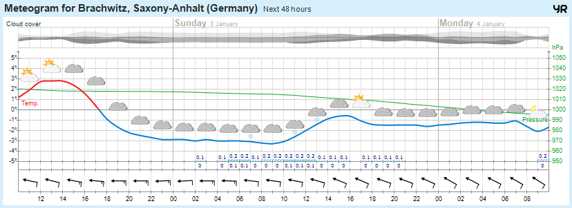 Detaillierter Wetterablauf: Heute Vormittag bis zum Abend zeigt sich der Himmel stark, zeitweise auch wechselnd bewölkt. Vereinzelt können einzelne Tropfen oder Flocken fallen. Meist bleibt es jedoch trocken. Besonders östlich der Elbe kann sich die Sonne zeitweise zeigen. Bei schwachem bis mäßigem Ostwind steigt die Temperatur auf 1 bis 3 Grad. Auf dem Brocken sind Sturmböen bis 85 km/h (Bft 9) und im Tiefland am Nachmittag einzelne Windböen bis 60 km/h (Bft 7) aus Südost zu erwarten. In der Nacht zum Sonntag ist es bedeckt und zwischen Harz und Burgenland fällt zeitweise etwas Schnee mit wenigen Zentimetern Neuschnee. Dabei tritt Straßenglätte auf. In den übrigen Regionen wird es niederschlagsfrei bleiben. Bei schwachem Südostwind werden Tiefsttemperaturen zwischen -3 und -7 Grad erwartet. Der Wind weht mäßig aus Südost und erreicht auf dem Brocken zeitweise Sturmstärke.
