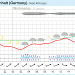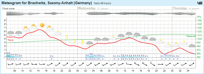 Am Mittwoch fällt aus einer geschlossenen Wolkendecke zeitweise Schnee oder Schneeregen. Bei schwachem bis mäßigem Wind aus Nordwest werden 2 bis 4, im Harz -2 bis 2 Grad erreicht. Auf dem Brocken kommt es zu Sturmböen bis 85 km/h (Bft 9). In der Nacht zum Donnerstag muss aus starker Bewölkung immer wieder mit leichten Schneefällen gerechnet werden. Die Minima liegen zwischen -1 und -3 Grad. Der Wind weht schwach und dreht auf Südwest bis Süd.