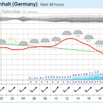 Am Samstag ist der Himmel vielfach bedeckt, nur in Richtung Erzgebirge und Oberlausitz kann sich anfangs noch die Sonne zeigen. In der Leipziger Tieflandsbucht setzt zum Nachmittag Regen ein, der sich bis zum Abend auf das ganze Land ausbreitet. Bei mäßigem bis frischem Südwestwind liegen die Höchsttemperaturen zwischen 8 und 11 im Bergland zwischen 3 und 7 Grad. Es treten Sturmböen bis 85 km/h (Bft 9), auf dem Fichtelberg Orkanböen bis 130 km/h (Bft 12) auf. In der Nacht zum Sonntag fällt zunächst verbreitet Regen, der in der zweiten Nachthälfte Schauercharakter annimmt. Auch ein kurzes Gewitter ist dann nicht ausgeschlossen. Die Schneefallgrenze sinkt auf etwa 300 m. Die Temperatur geht auf 3 bis 1, im Bergland auf 0 bis -3 Grad zurück. Es treten zunächst noch stürmische Böen bis 75 km/h (Bft 8), auf dem Fichtelberg orkanartige Böen bis 115 km/h (Bft 11) auf. Im weiteren Verlauf lässt der Wind vorübergehend deutlich nach, frischt in der zweiten Nachthälfte aber in Schauer- und Gewitternähe in Böen erneut stark bis stürmisch auf.