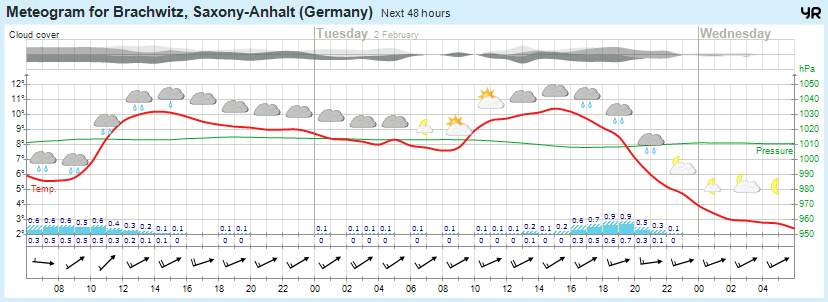 Am Dienstag kommen bei starker Bewölkung die schauerartigen Regenfälle zögerlich südwärts voran. Die Schneefallgrenze sinkt dabei auf 800 m. Im Verlauf der zweiten Tageshälfte wird es in Altmark und Börde wieder niederschlagsfrei sein und die Wolkendecke lockert auf. Der frische bis starke Südwestwind führt weiterhin sehr milde Luftmassen in die Region, so dass die Höchsttemperaturen zwischen 11 und 13, im Harz bei 6 bis 11 Grad liegen. Dabei kommt es verbreitet zu starken bis stürmischen Böen bis 75 km/h (Bft 8), auf dem Brocken zu Orkanböen über 120 km/h (Bft 12). In der Nacht zum Mittwoch lockert die Bewölkung von Norden her auf, die letzten Regenfälle ziehen aus dem Burgenland südwärts ab. Die Temperaturen gehen auf Werte zwischen 4 und 2, im Harz bis -2 Grad zurück. Der Südwestwind schwächt sich im Laufe der Nacht etwas ab, es treten aber noch Windböen bis 60 km/h (Bft 7), auf dem Brocken Orkanböen bis 135 km/h (Bft 12) auf.