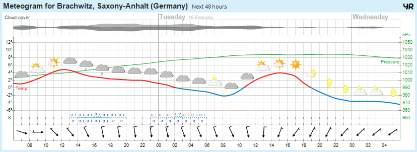 Am Mittwoch breitet sich nach freundlichem Beginn von Süden dichter werdende Bewölkung aus und abends setzt im Burgenland leichter Schneefall ein. Die Temperatur erreicht nur 1 bis 3, im Harz -2 bis 1 Grad. Es weht schwacher Ostwind. In der Nacht zum Donnerstag breiten sich die leichten Schneefälle nordwärts bis in die Altmark aus. Die Wolkendecke ist geschlossen. Die Temperatur geht auf -2 bis -4, im Harz bis -6 Grad zurück. Der schwache Wind weht aus östlichen Richtungen.