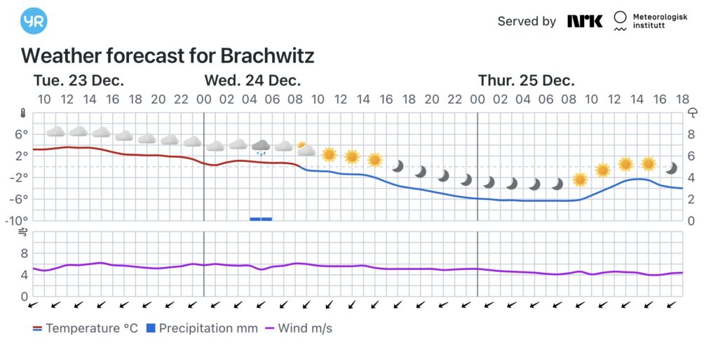 Am Mittwoch neben vielen Wolken auch kurze Auflockerungen. Höchsttemperaturen -2 bis 1, im Harz je nach Höhenlage -6 bis -1 Grad. Schwacher bis mäßiger, teils böiger Nordostwind, im Harz Wind-, auf dem Brocken Sturmböen. In der Nacht zum Donnerstag zunehmend sternenklar. Niederschlagsfrei. Temperaturrückgang auf -6 bis -10 Grad. Schwacher bis mäßiger Wind aus Nordost, auf dem Brocken Sturm.