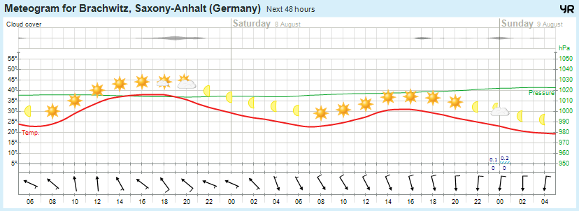 Am Sonntag beginnt der Tag wolkig, vor allem Richtung Wittenberg und Jessen sind noch dichtere Wolkenfelder am Himmel zu finden. Niederschlag wird nicht mehr erwartet. Bei schwachem Wind um Nordost steigt die Temperatur auf 27 bis 30, im Harz auf 22 bis 26 Grad. In der Nacht zum Montag ist es überwiegend locker bewölkt, nur im Burgenland und in Anhalt sind zeitweise dichtere Wolkenfelder vorhanden. Niederschlag wird nicht erwartet. Bei schwachem Wind aus Ost fällt die Temperatur auf 18 bis 15, im Harz auf 16 bis 14 Grad.