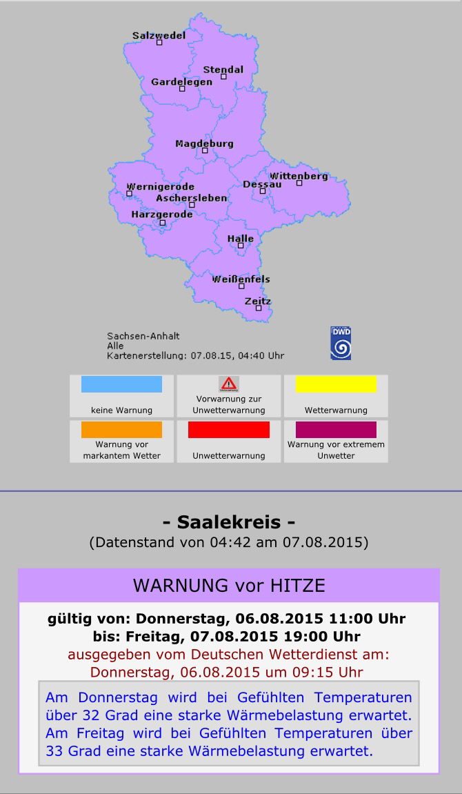 Heute wird bei gefühlten Temperaturen über 33 Grad eine starke Wärmebelastung erwartet. Zum Abend bzw. in der Nacht zum Samstag können zwischen Harz und Altmark teils starke Gewitter auftreten. Dabei sind Starkregen bis 25 L/qm innerhalb kurzer Zeit, Sturmböen um 75 km/h (Bft 8 und 9) und Hagel möglich.