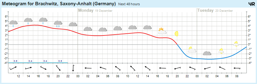 Am Montag fällt anfangs aus einer geschlossenen Wolkendecke immer wieder Sprühregen. Ab den Mittagsstunden wird es vermehrt trocken bleiben und die Wolkendecke lockert von Südosten her auf. Bei schwachem Südostwind werden Maxima zwischen 4 und 6, im Harz zwischen 0 und 4 Grad erwartet. In der Nacht zum Dienstag lösen sich letzte Hochnebelfelder auf. Niederschlag wird nicht erwartet. Allerdings bilden sich örtlich teils dichte Nebelfelder. Die Temperatur geht auf 0 -3 Grad zurück. Der Südostwind weht schwach.
