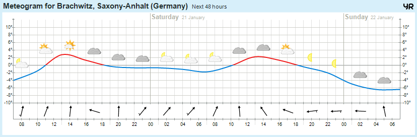 Am Sonnabend bleibt der Himmel in der Nordhälfte bedeckt. In der Südhälfte zeigen sich im Tagesverlauf dagegen vermehrt Auflockerungen mit Sonnenschein. Es bleibt trocken. Der Wind weht schwach aus Südost. Die Temperatur liegt von Süd nach Nord bei -2 bis 4 Grad. In der Nacht zum Sonntag lockert die Bewölkung weiter auf, sodass es vielfach nur noch wolkig oder gering bewölkt sein wird. Niederschlag fällt nicht. Der Wind weht schwach aus Südost und die Temperatur geht auf -3 Grad in der nördlichen Altmark und bis -9 Grad im Raum Zeitz zurück.