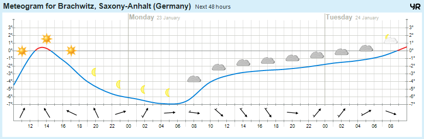Am Montag kommt von Nordwesten her starke Bewölkung auf, aus der bevorzugt in der zweiten Tageshälfte vereinzelt etwas Schnee oder gefrierender Sprühregen fallen kann. Im Erzgebirge scheint anfangs noch die Sonne. Bei schwachem Südwestwind werden Tageshöchstwerte von -4 bis -1, im Bergland von -6 bis -3 Grad erwartet. In der Nacht zum Dienstag ist es überwiegend bedeckt und örtlich fällt geringer gefrierender Sprühregen oder Schneegriesel. Bei -3 bis -6, im Bergland bis -9 Grad weht schwacher Westwind.