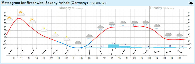 Am Montag herrscht verbreitet starke Bewölkung. Gelegentlich fällt Regen, auf dem Brocken zeitweise auch Schnee. Der Wind weht schwach aus südlichen Richtungen. Die Temperatur erreicht 2 bis 5, im Harz 0 bis 4 Grad. In der Nacht zum Dienstag ist es anfangs stark bewölkt und im Süden kann noch etwas leichter Regen fallen. Im Laufe der ersten Nachthälfte lockert die Bewölkung auf und der Niederschlag endet. Ausgangs der Nacht kann es örtlich Glätte durch überfrierende Nässe geben. Der Wind weht schwach aus südlichen Richtungen. Die Temperatur geht auf 2 bis -2 Grad zurück.