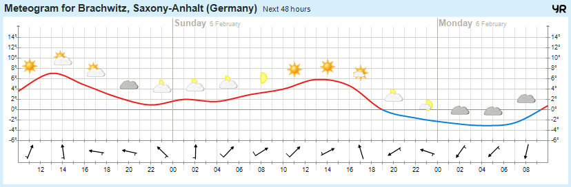 Am Sonntag ist es wolkig, teils heiter und überwiegend niederschlagsfrei. Letzter Regen der in der Früh und am Vormittag noch örtlich vorhanden ist, klingt rasch ab. Die größten Chancen auf Sonnenschein gibt es in Westsachsen. Bei schwachem Südwestwind steigt die Temperatur auf 6 bis 8, im Bergland auf 1 bis 5 Grad. In der Nacht zum Montag wird es bei Tiefstwerten zwischen 1 und -3 Grad und schwachem Wind weitgehend niederschlagsfrei sein. Dabei ist es stark bewölkt.
