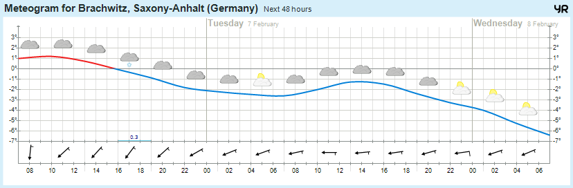 Detaillierter Wetterablauf: Heute früh ziehen viele Wolken am Himmel vorüber und bringen gelegentlich leichten Sprühregen oder Schneegriesel. Morgendliche Nebelfelder lichten sich bis zum Mittag. Es ist gebietsweise glatt! Im weiteren Tagesverlauf ändert sich daran wenig. Wiederholt fällt aus stark bewölktem Himmel etwas Sprühregen oder Schneegriesel. Besonders im Harz muss gebietsweise mit Glätte gerechnet werden. Die Höchstwerte liegen zwischen 1 und 3, im Harz zwischen -2 und +2 Grad. Es weht schwacher Nordostwind. In der Nacht zum Dienstag bleibt es wolkenverhangen. Weiterhin fällt gelegentlich geringer Schneegriesel, leichter Schneefall oder gefrierender Sprühregen. Dadurch kommt es zu Glätte. Die Minima liegen bei schwachem Ostwind zwischen -2 und -4 Grad, im Harz zwischen -3 und -6 Grad.