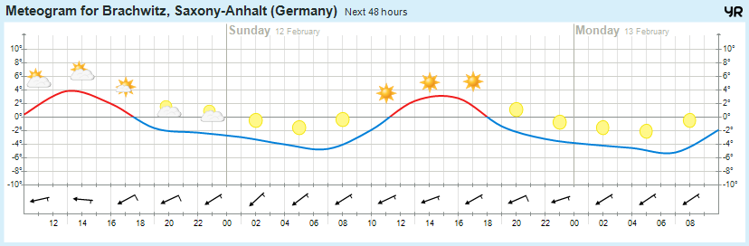 Detaillierter Wetterablauf: Heute Vormittag fällt aus einer dichten Wolkendecke gebietsweise Schnee. Dadurch werden 1 bis 2 cm Neuschnee erwartet. Der Niederschlag zieht im Vormittagsverlauf nach Anhalt, Börde und Altmark weiter. Danach bleibt es meist niederschlagsfrei. Bei meist schwachem Ostwind werden -2 bis 2 Grad erwartet. In der Nacht zum Sonntag ist es meist stark bewölkt oder bedeckt aber meist trocken. In der zweiten Nachthälfte kann die Bewölkung stellenweise etwas auflockern. Es werden Minima zwischen -3 und -6, im Harz bis -7 Grad und schwacher Ostwind erwartet.