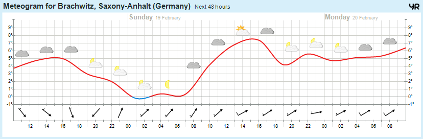 Am Sonntag breiten sich dichte Wolken von Nordwesten her auf alle Regionen aus und ab den Mittagsstunden setzt von der Altmark her leichter Regen ein. Dieser erreicht im Verlauf des Nachmittags auch die südlichsten und östlichsten Landesteile. Die Temperatur steigt dabei auf 6 bis 9, im Harz auf 3 bis 6 Grad und der Wind weht schwach bis mäßig aus Südwest, auf dem Brocken teils stürmisch. In der Nacht zum Montag kann bei starker Bewölkung anfangs etwas Regen fallen, in der zweiten Nachthälfte bleibt es meist trocken. Die Temperatur geht auf 6 bis 3, im Harz auf 3 bis -1 Grad zurück. Der Wind weht schwach bis mäßig, im Harz teils stürmisch aus Südwest. Auf dem Brocken kommt es zu Sturmböen bis 85 km/h (Bft 9).