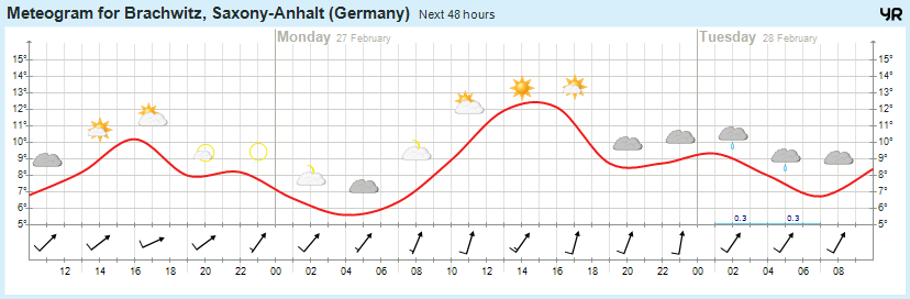 Detaillierter Wetterablauf: Heute Vormittag ist der Himmel stark bewölkt und gelegentlich regnet es leicht. Daran ändert sich bis zum Mittag wenig. Nachfolgend lockert die Bewölkung auf, besonders im Süden zeigt sich zeitweise die Sonne und es treten nur noch vereinzelt kurze Schauer auf. Meist bleibt es trocken. Der Wind weht schwach bis mäßig aus Südwest. Im Harz und dessen Umland sind Windböen bis 60 km/h (Bft 7) möglich. Auf dem Brocken kommt es weiterhin zu schweren Sturmböen bis 100 km/h (Bft 10). Die Temperatur erreicht 9 bis 11, im Harz 2 bis 9 Grad. In der Nacht zum Montag ist es teils stark, teils aufgelockert bewölkt und niederschlagsfrei. Der Wind weht schwach aus Süd- bis Südwest. Auf dem Brocken treten schwere Sturmböen bis 100 km/h (Bft 10) auf. Die Tiefstwerte liegen zwischen 7 und 4, im Harz zwischen 4 und 1 Grad.