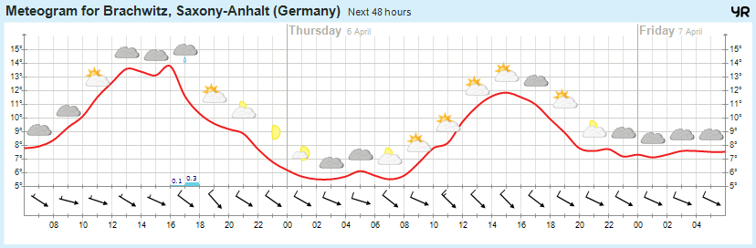 Detaillierter Wetterablauf: Heute ist es wechselnd bewölkt. Vereinzelt ziehen Schauer durch. Der Wind weht anfangs schwach aus Südwest, dreht aber bei Zunahme am Nachmittag auf Nordwest. Dann sind einzelne Windböen bis 55 km/h (Bft 7) nicht ausgeschlossen. Auf dem Brocken treten Sturmböen bis 85 km/h (Bft 9) auf. Die Temperatur erreicht in den Mittagsstunden 11 bis 14, im Harz 6 bis 12 Grad. In der am Nachmittag einfließenden kühlen Luft aus Nordwest gehen sie aber rasch auf 7 bis 10 Grad zurück. In der Nacht zum Donnerstag ist der Himmel meist stark bewölkt. Niederschlag fällt aber kaum. Der Wind weht mäßig, in Böen auch frisch aus Nordwest. Auf dem Brocken treten Sturmböen um 80 km/h (Bft 9) auf. Die Temperatur geht auf 4 bis 2, auf dem Brocken bis -1 Grad zurück. Dort besteht Glättegefahr durch überfrierende Nässe.