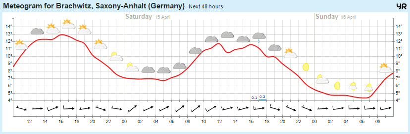 Am Samstag fällt bei bedecktem Himmel vor allem vormittags zeitweise Regen. Nachmittags treten dann gelegentlich noch Schauer auf und die Sonne zeigt sich vorübergehend. Der Wind weht mäßig mit Windböen aus West, auf dem Brocken treten Sturmböen, gegen Abend teils orkanartige Böen auf. Die Temperatur steigt auf 11 bis 13, im Harz auf 3 bis 9 Grad. In der Nacht zum Sonntag gibt es bei wechselnder Bewölkung einzelne Schauer, die im Harz als Schnee fallen. Der Wind weht mäßig und teils böig, auf dem Brocken auch mit Sturmböen. Die Temperatur geht auf 5 bis 1, im Harz 1 bis -2 Grad zurück. In Bodennähe ist auch im Tiefland gebietsweise leichter Frost möglich.