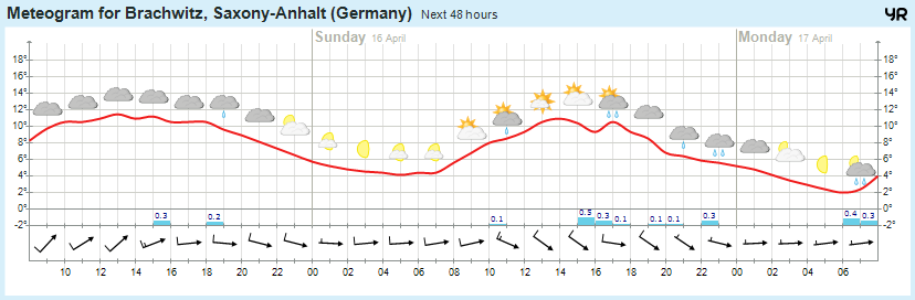 Detaillierter Wetterablauf: Heute Vormittag zieht bei stark bewölktem Himmel ein schwaches Niederschlagsgebiet von Nordwesten nach Südosten vorüber. Nachfolgend lockert die Bewölkung in der zweiten Tageshälfte auf und zwischen den Quellwolken gibt es gelegentlich Sonnenschein, aber auch einzelne Schauer. Auf dem Brocken wird etwas Schnee erwartet. Der Wind weht mäßig bis teils frisch und böig mit Windböen bis 60 km/h (Bft 7) sowie im Norden gelegentlich mit stürmischen Böen bis 75 km/h (Bft 8) aus West. Auf dem Brocken treten schwere Sturmböen bis 100 km/h (Bft 10) auf. Die Temperatur steigt auf 11 bis 13, im Harz auf 3 bis 9 Grad. In der Nacht zum Ostersonntag ist es zunächst gering bewölkt, später zieht von Norden her wieder dichtere Bewölkung auf. Niederschlag wird nicht erwartet, nur vereinzelt kommt es in der Altmark zu Schauern. Der Wind weht schwach und teils böig aus West. Auf dem Brocken treten schwere Sturmböen bis 100 km/h (Bft 10), nach Mitternacht nur noch Sturmböen bis 85 km/h (Bft 9) auf. Die Temperatur geht auf 4 bis 1, im Harz 1 bis -2 Grad zurück. Stellenweise, vor allem im Harz kann leichter Frost in Bodennähe auftreten.