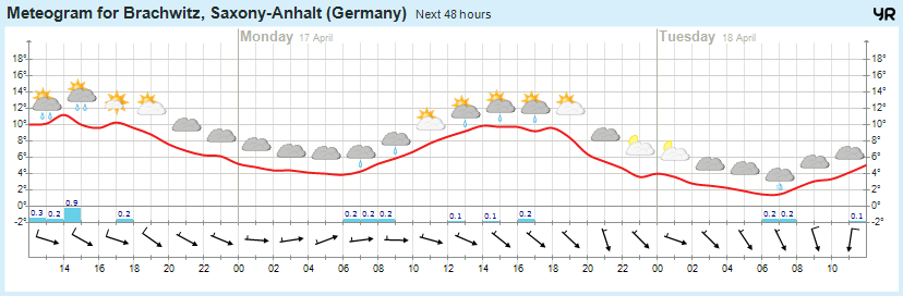 Am Montag bilden sich erneut zahlreiche Quellwolken, aus denen wiederholt Schauer zu erwarten sind. Im Harz fallen diese oberhalb von 600 m als Schnee. Dort wird es glatt. Es können auch kurze Gewitter auftreten. Die Temperatur steigt nur auf 8 bis 10, im Harz je nach Höhenlage auf 1 bis 7 Grad. Der Wind frischt mäßig auf und dreht auf Nord bis Nordost. In der Nacht zum Dienstag lockert die Bewölkung zeitweise auf und die Schauerniederschläge werden seltener. Die Luft kühlt auf 2 bis -1, im Harz auf 0 bis -4 Grad ab. Verbreitet muss mit Frost in Bodennähe gerechnet werden. Der Wind weht weiterhin mäßig aus Nordost.