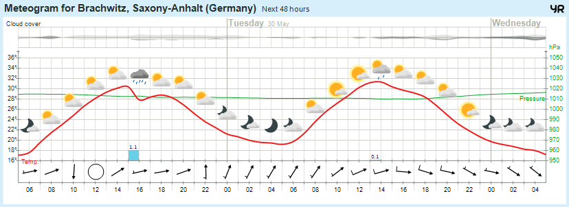 Am Dienstag bilden sich nach sonnigem Beginn zahlreiche Quellwolken, die nachmittags und abends besonders in der Südhälfte des Landes für Schauer und Gewitter sorgen. Diese können mit Starkregen, Hagel und Sturmböen verbunden sein. Bei sonst schwachem Westwind werden Maxima von West nach Ost von 27 bis 32, im Harz von 21 bis 28 Grad erreicht. In der Nacht zum Mittwoch ziehen die schauerartigen und teils gewittrigen Niederschläge ostwärts ab und nachfolgend wird es bei wolkigem Himmel niederschlagsfrei sein. Die Luft kühlt auf 16 bis 13, im Harz bis 11 Grad ab. Der Nordwestwind weht außerhalb von Schauern und Gewittern schwach.