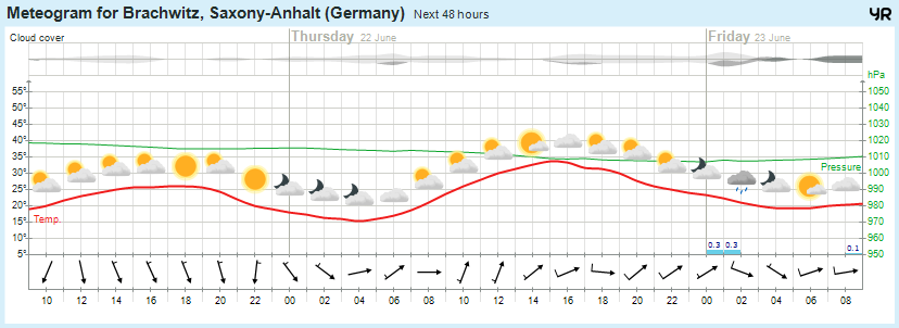 Am Donnerstag können sich bei einem Mix aus Sonne und Wolken bereits am Vormittag erste Schauer und Gewitter bilden. Schon zu Beginn können diese teils kräftig ausfallen, gewinnen aber im weiteren zeitlichen Verlauf noch an Intensität. Ab dem Nachmittag können diese dann örtlich unwetterartig ausfallen mit teils heftigem Starkregen, Hagel und schweren Sturmböen. Der südliche Wind weht abseits von Schauern und Gewittern zunächst schwach, ehe er am Nachmittag und Abend auf West dreht und auffrischt. Die Temperatur steigt von Nord nach Süd auf 29 bis 34, im Harz auf 25 bis 30 Grad. In der Nacht zum Freitag klingen die teils starken Schauer und Gewitter zögerlich ab und die Wolken lockern von Westen auf. Die Minima liegen zwischen 18 und 14 Grad. Der Westwind weht mäßig. Auf dem Brocken gibt es Sturmböen.