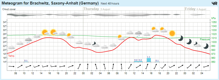 Detaillierter Wetterablauf: Heute Früh sowie tagsüber ist es teils heiter, teils wolkig. Vereinzelt entwickeln sich im Tagesverlauf Schauer. Bei schwachem westlichem Wind werden Maxima zwischen 26 und 28, im Harz zwischen 19 und 26 Grad erreicht. In der Nacht zum Donnerstag verdichtet sich die Bewölkung allmählich und von Westen her kommt etwas Regen auf. Die Luft kühlt auf 18 bis 16, im Harz bis 14 Grad ab. Der Südostwind weht meist schwach und nimmt auf dem Brocken ausgangs der Nacht allmählich zu.