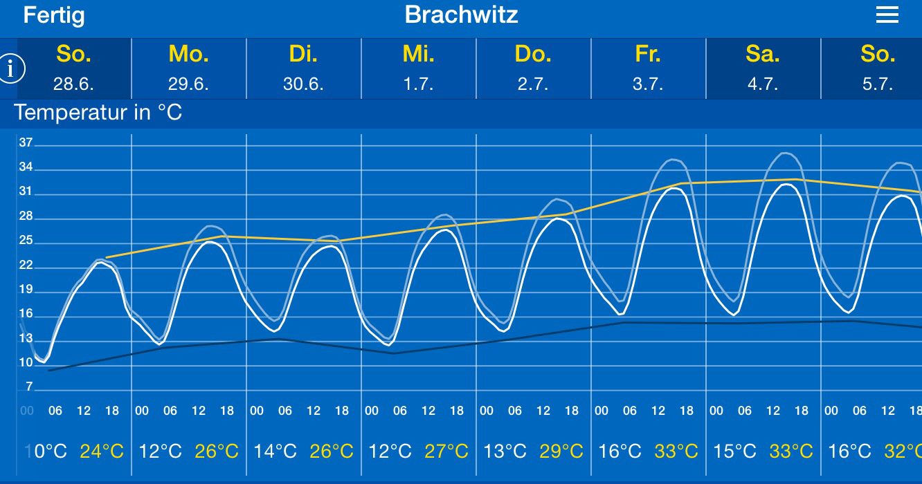Am Mittwoch ist es meist sonnig, nur östlich der Elbe entwickeln sich im Tagesverlauf harmlose Quellwolken. Es bleibt überall trocken. Bei schwachem Ostwind werden Maxima zwischen 28 und 30, im Harz zwischen 24 und 28 Grad erwartet. In der Nacht zum Donnerstag ist es wolkenlos und trocken. Die Luft kühlt auf 15 bis 13, im Harz bis 12 Grad ab. Der Ostwind weht schwach.