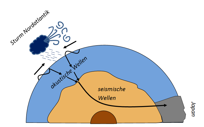 An dieser Stelle können heftige Stürme über dem Ozean helfen. Diese erzeugen auf dem Meer Wellen, die so kräftig sein können, dass ein kleiner Teil der damit verbundenen Energie als akustische Wellen den Meeresboden erreicht. Dort angekommen, generiert die Energie schwache P- und S-Wellen, die sich durch das Gestein ausbreiten. So, als ob an dieser Stelle ein kleines Erdbeben stattgefunden hätte. Die unten stehende Abbildung soll dies schematisch darstellen.