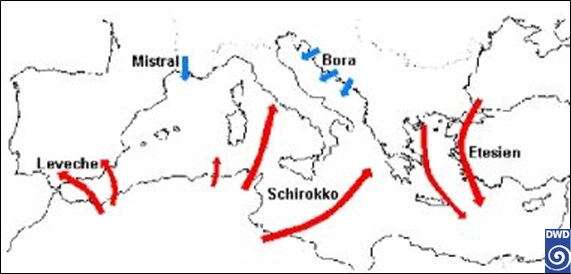Ein ähnliches Windsystem stellt der sogenannte „Leveche“ dar. Durch die Zufuhr heißer Luftmassen aus der westlichen Sahara, die sich nach Überströmen des Atlasgebirges noch weiter erhitzen, entsteht ein heißer Wüstenwind, der insbesondere dem Süden Spaniens hohe Temperaturen beschert und ebenfalls viel Saharastaub mit im Gepäck haben kann. Die „Bora“ und der „Mistral“ sind im Gegensatz zum „Schirokko“ und „Leveche“ kalte Winde, die vor allem während der Wintermonate auftreten und zu markanten Kaltlufteinbrüchen führen können. Während die Bora entlang der kroatischen Küste auftritt, ist der „Mistral“ ein charakteristischer Wind Südfrankreichs. Kommt es während der Wintermonate zu einer Verschiebung eines über Frankreich liegenden Hochs in östlicher Richtung bei gleichzeitigen Auftreten eines Tiefs über dem Golf von Genua, hat dies den Effekt, dass sich Winde entwickeln, die durch das von Nord nach Süd verlaufende Rhônetal, in Richtung französischer Mittelmeerküste wehen. Durch den „Düseneffekt“ des Rhônetals kann dieser Wind oftmals Sturm- bis Orkanstärke mit Spitzengeschwindigkeiten von mehr als 135 km/h erreichen. Nicht zuletzt zeigt sich diese Naturgewalt sehr deutlich an Hand der oft in Windrichtung gewachsenen Bäume. Die „Bora“ entsteht dagegen, wenn hoher Luftdruck über dem Balkan zeitgleich tiefem Luftdruck südlich der Alpen gegenübersteht. Dabei können die kalten Winde bis an die Meeresküste vorstoßen, wo sie sich auf Grund des geringen Höhenunterschieds zur Küste hin kaum erwärmen.
